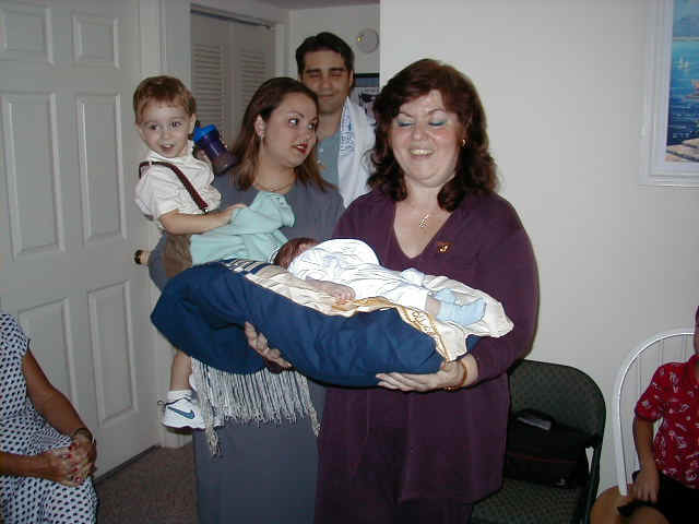 Auntie M and Tio holding Eitan during bris |